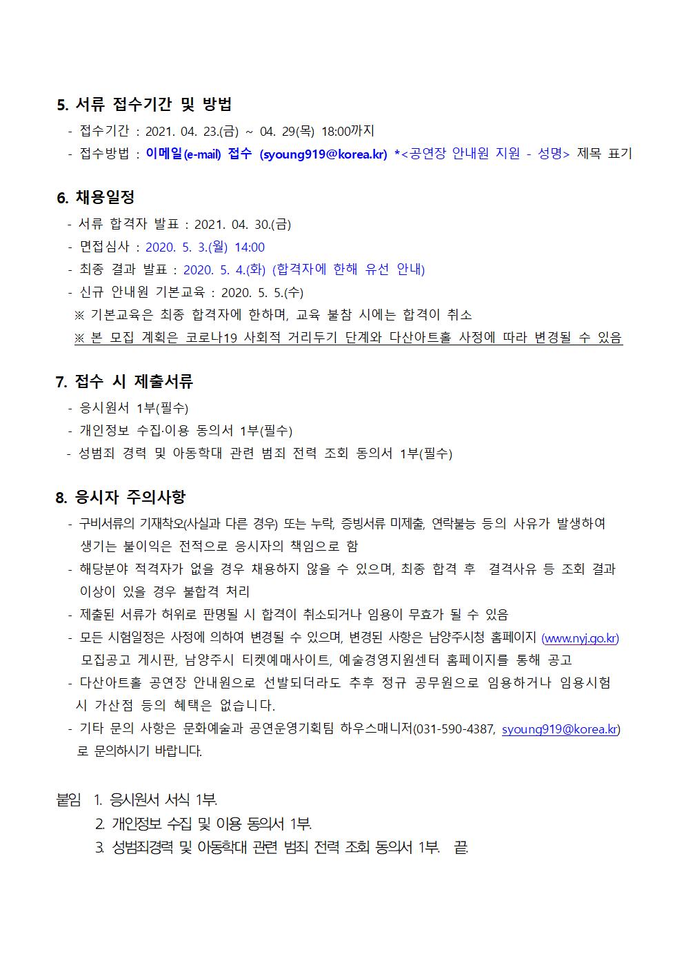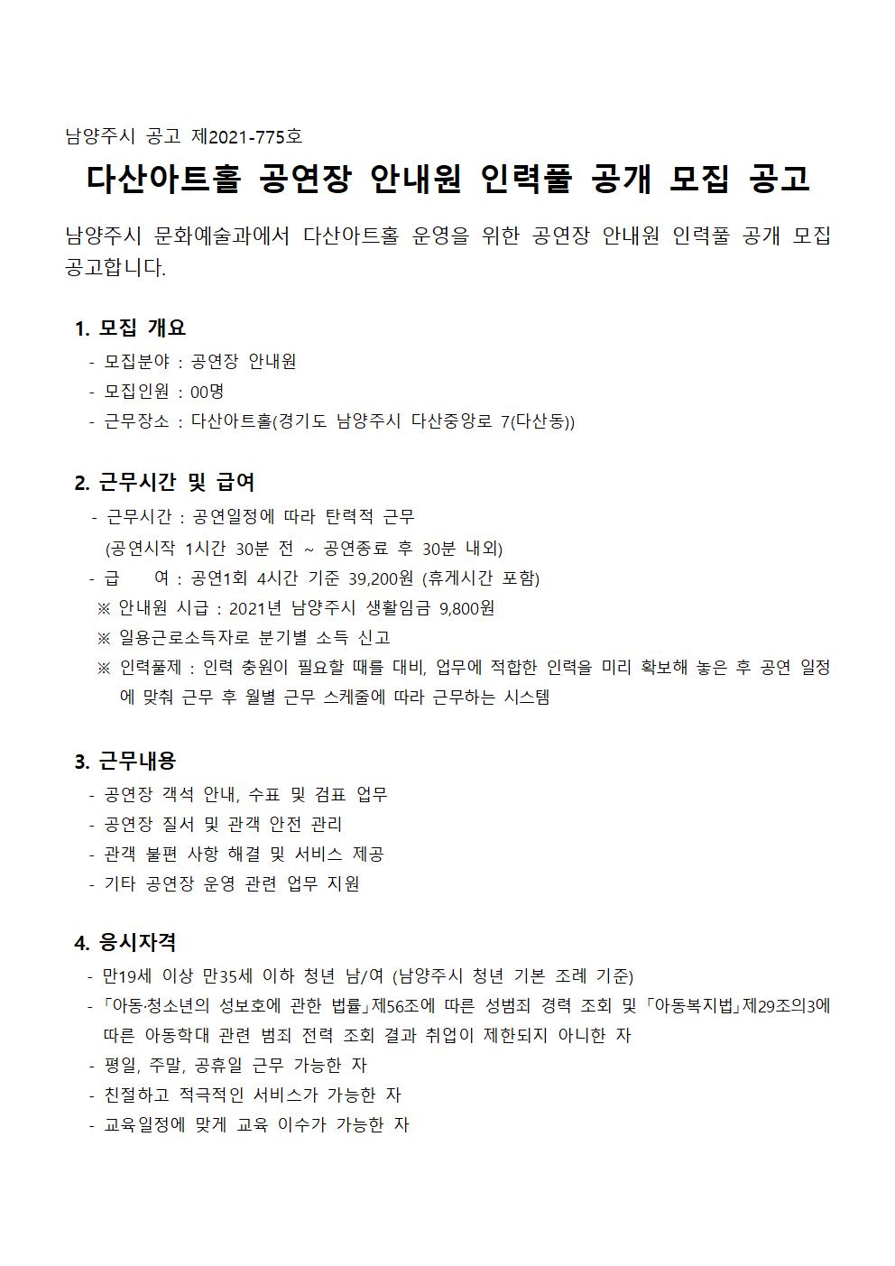 | 2021년 상반기 다산아트홀 공연장 안내원 인력풀 공개 모집 공고 | |