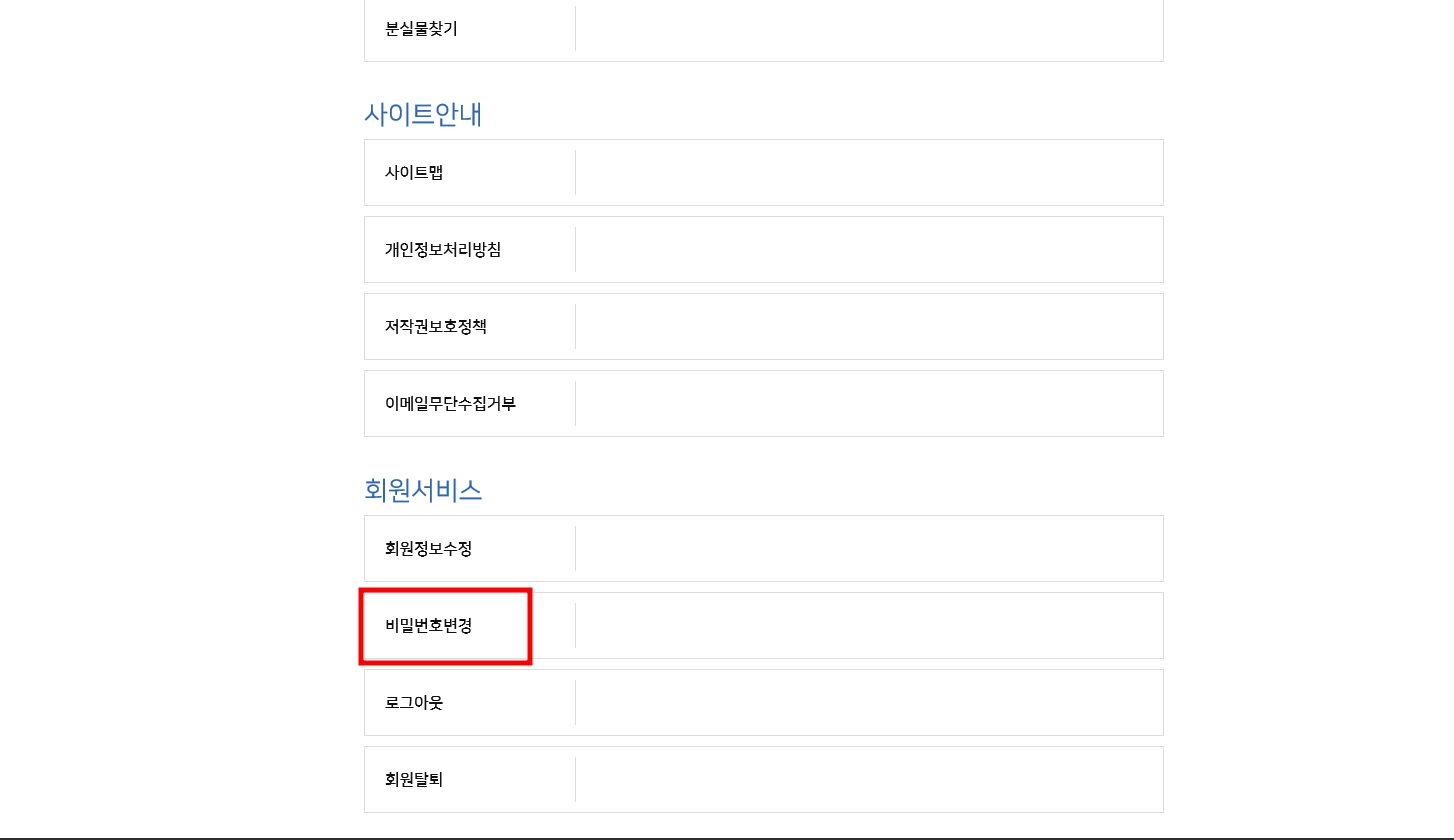 안녕하세요. 비밀 번호 변경은 홈페이지 로그인 후 사이트맵을 클릭하신 후 목록 하단의 회원서비스 메뉴 중 비빌번호 변경을 선택 후 비밀 번호 변경을 하시기 바랍니다. 감사합니다. |