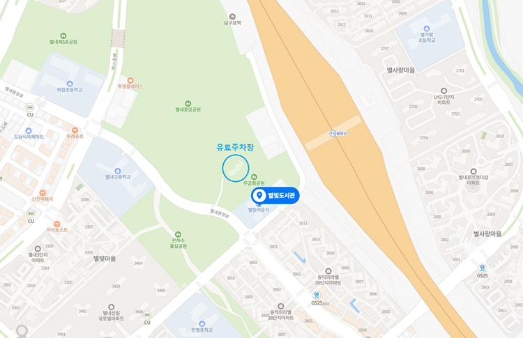 ※ 도서관 주차공간이 협소하오니 가급적 대중교통 및 별내중앙공원(별내중앙로112) 유료주차장을 이용해 주시기 바랍니다.