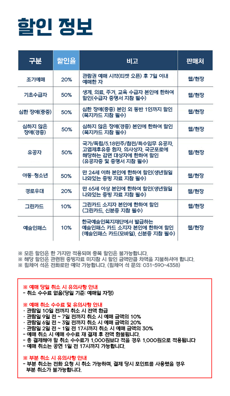 · 예매는 공연 1시간 전, 취소는 공연 1일 전 오후 5시까지 가능합니다.