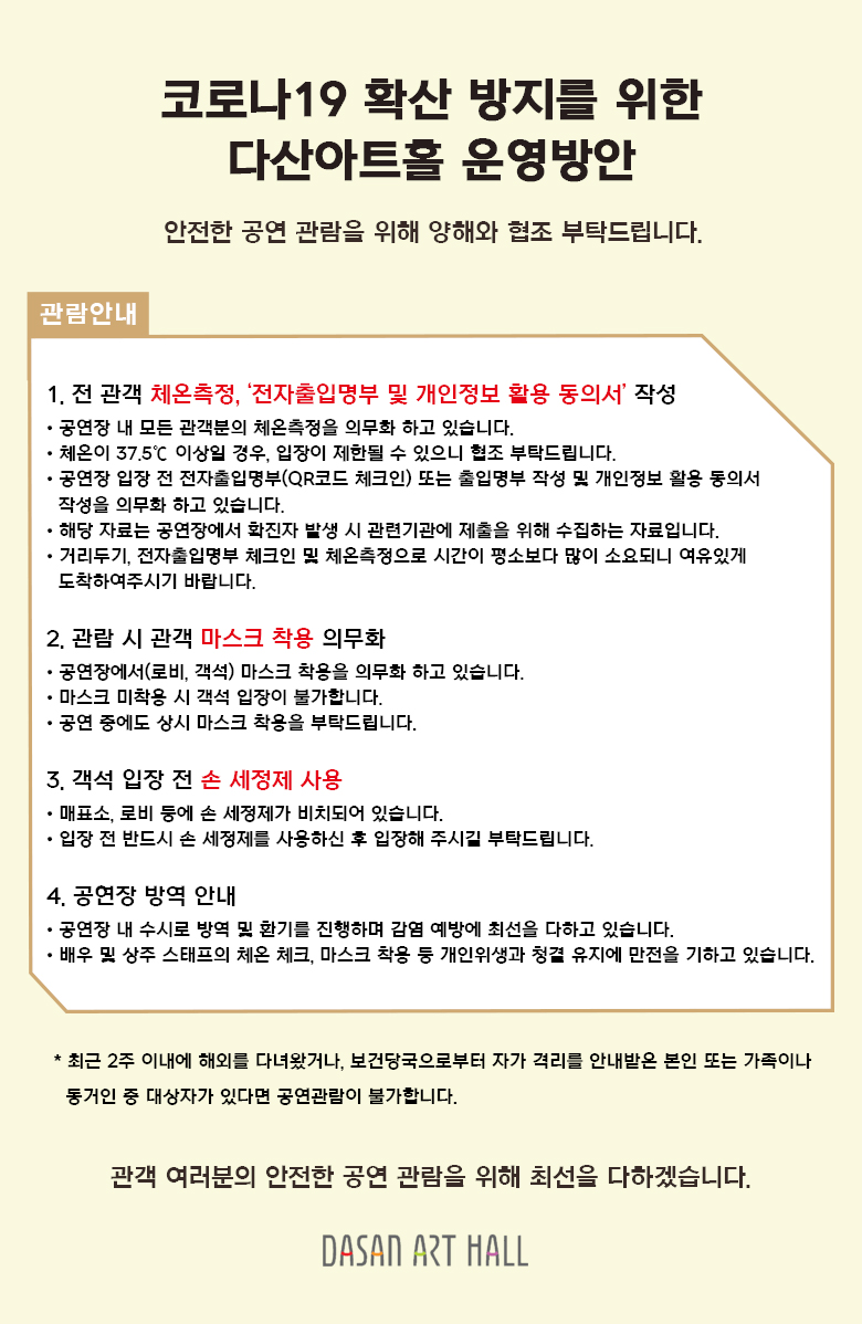 * 코로나19 확산 방지를 위해 공연장에서(로비, 객석) 마스크 착용을 의무화하고 있습니다.