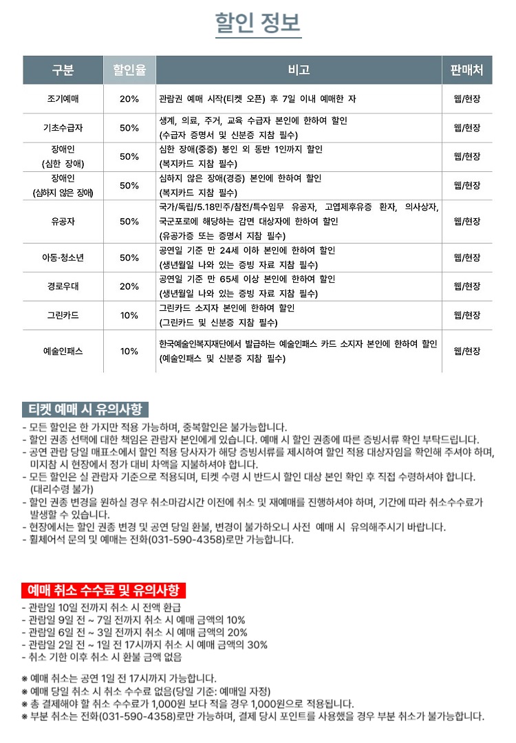 · 예매는 공연 1시간 전, 취소 및 변경은 공연 1일 전 오후 5시까지 가능합니다.