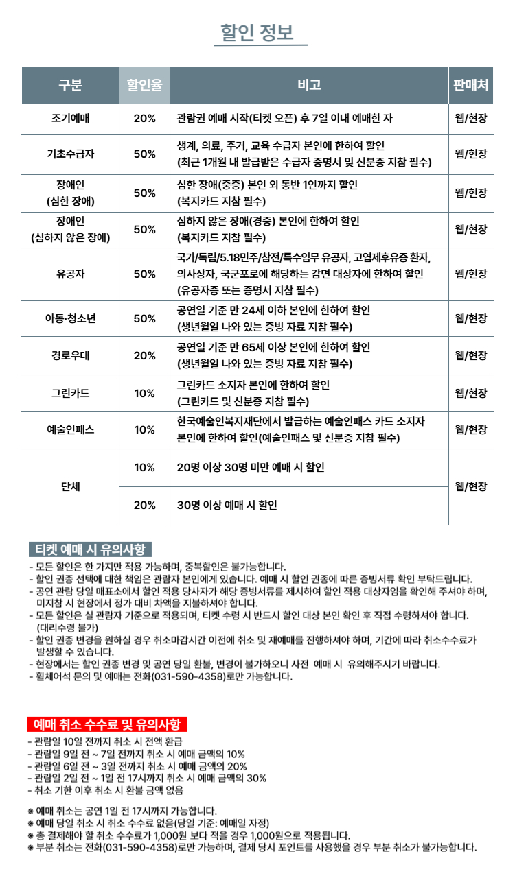 · 예매는 공연 1시간 전, 취소 및 변경은 공연 1일 전 오후 5시까지 가능합니다.