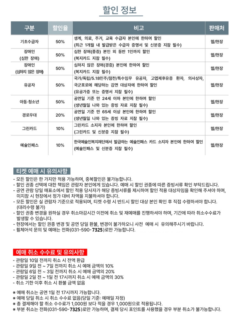 · 예매는 공연 1시간 전, 취소 및 변경은 공연 1일 전 오후 5시까지 가능합니다.