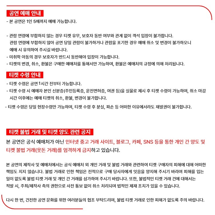 - 공연장 주변이 혼잡할 수 있으니 일찍 도착하여 주시기 바랍니다.