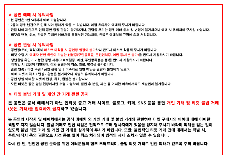 * 예매, 취소 및 변경은 공연 1일 전 오후 5시까지 가능합니다.