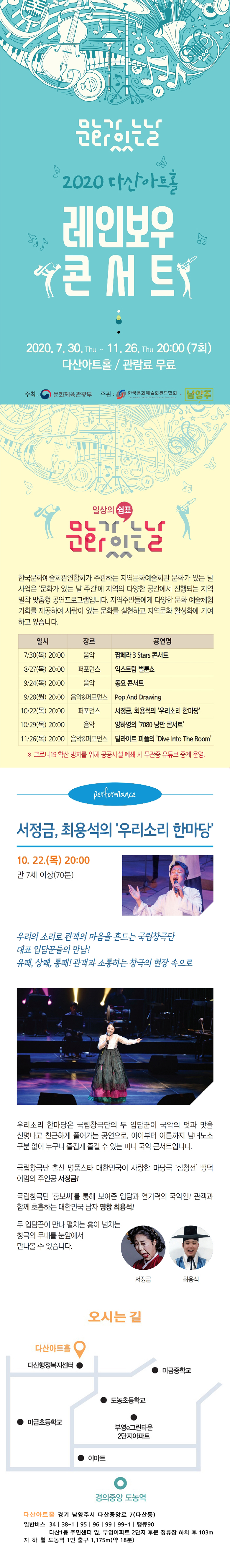 【기획공연】<2020 다산아트홀 레인보우 콘서트> - 서정금, 김기진의 '우리소리 한마당'