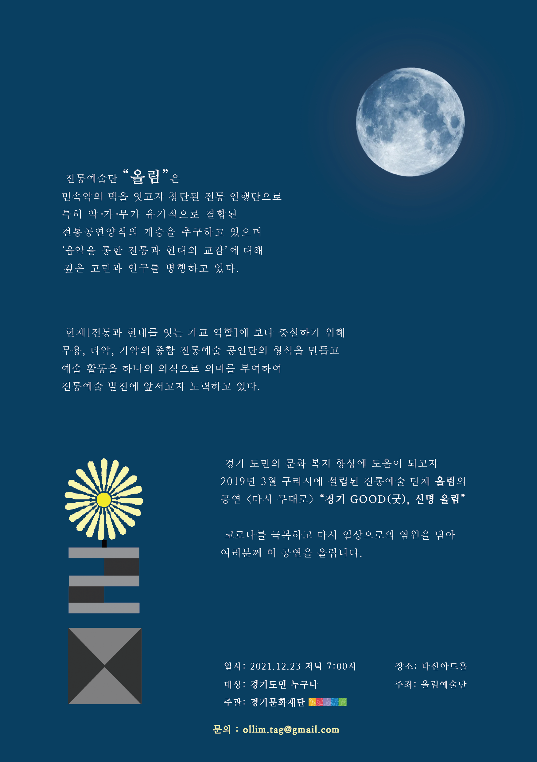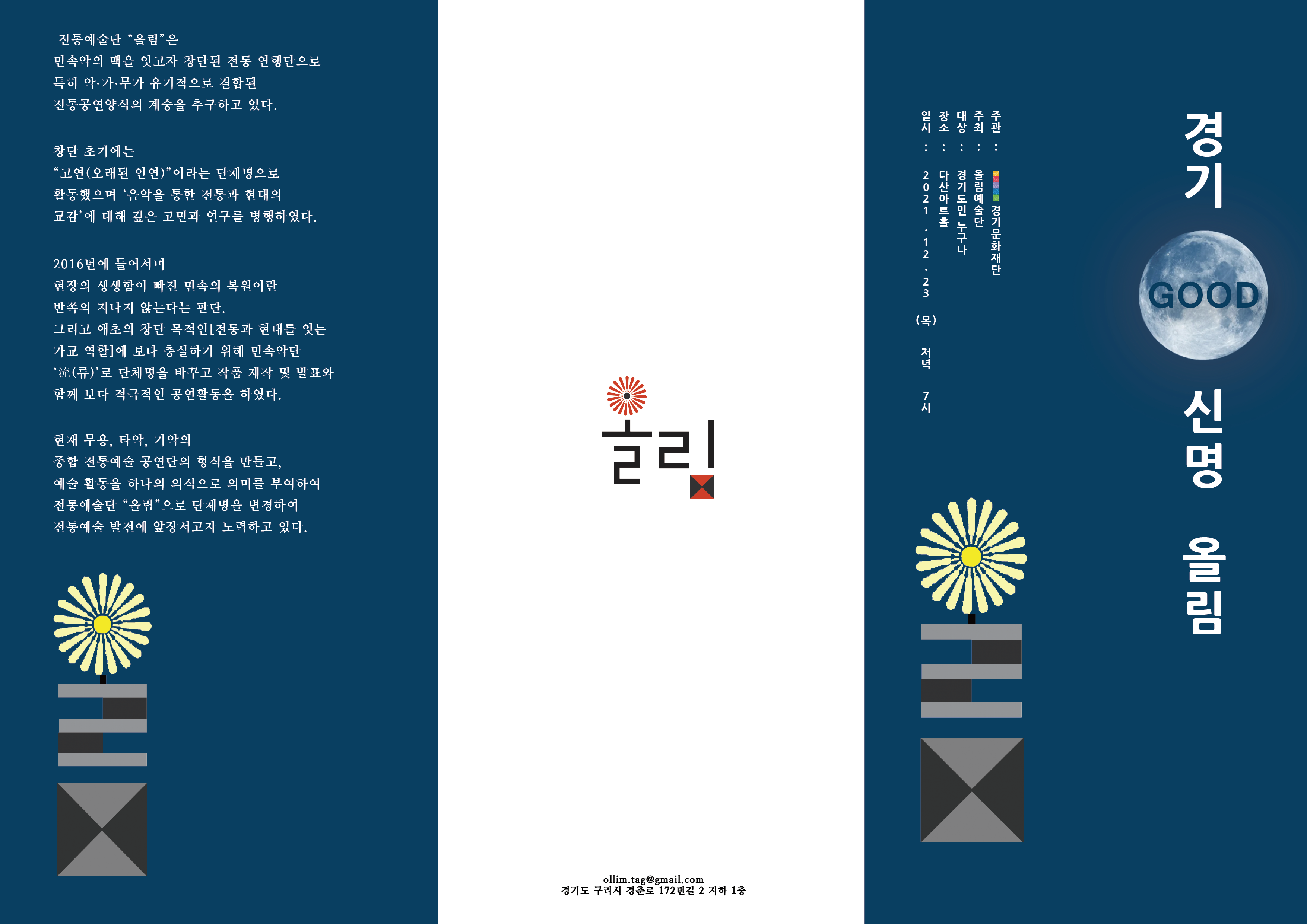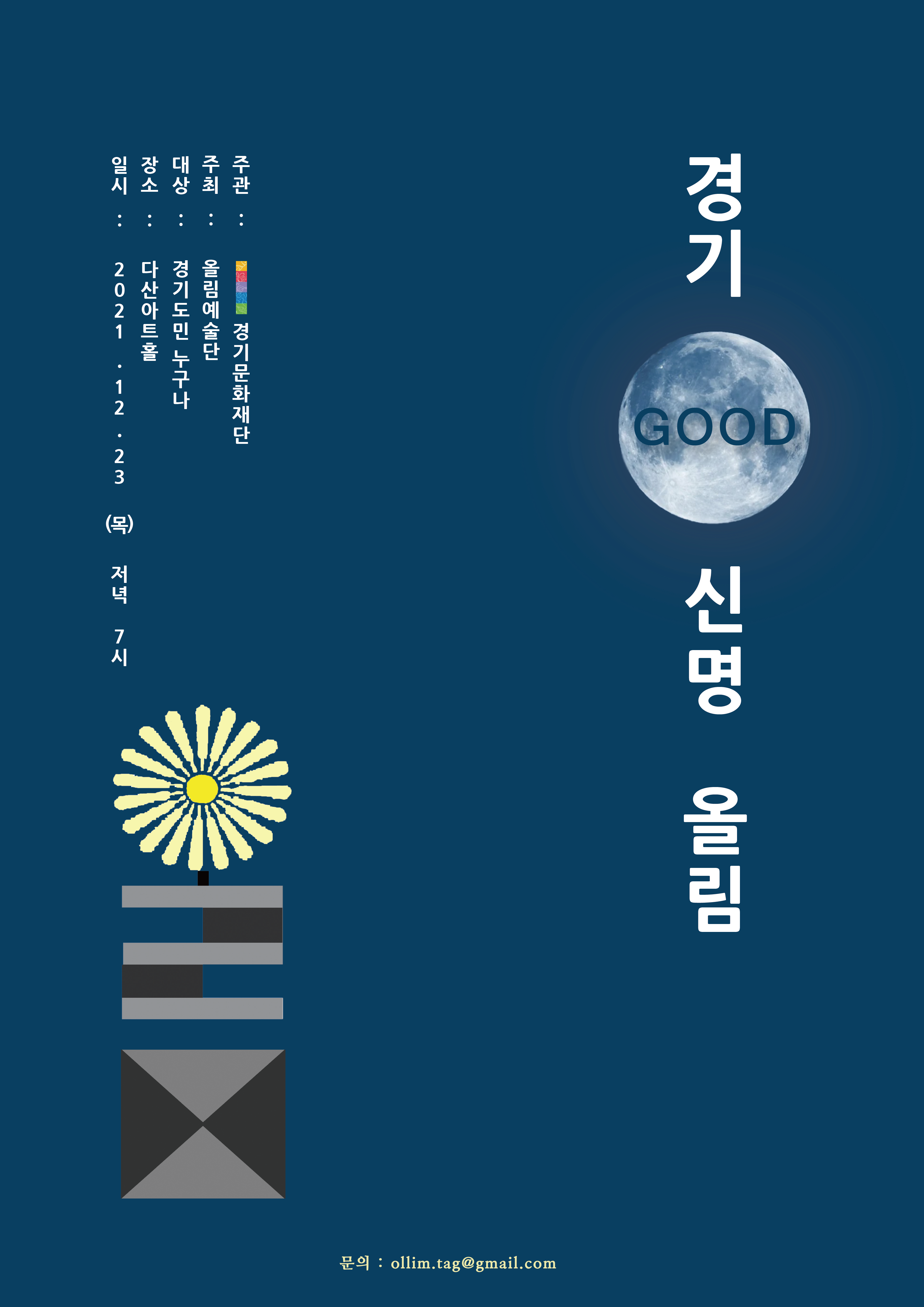 【대관공연】경기 GOOD 신명 올림 장소 다산아트홀 기간 2021년 12월 23일 ~ 2021년 12월 23일 공연시간 75분 입장권 가격 관람등급 전연령가능 문의 ollim.tag@gmail.com 공연관련 문의는 대관 단체로 연락바랍니다. 문의:ollim.tag@gmail.com 1639434517607-1.png [ Size : 471.95KB, Down : 188 ] 미리보기 다운로드 1639434517607-0.png [ Size : 1.55MB, Down : 446 ] 미리보기 다운로드 1639434517607-2.png [ Size : 585.58KB, Down : 425 ] 미리보기 다운로드 1639434517607-3.png [ Size : 778.88KB, Down : 443 ] 미리보기 다운로드 목록보기