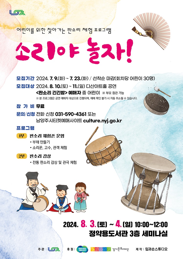 ★ 공연 예매자 중 어린이 관객 대상으로 판소리 체험 프로그램 '소리야 놀자'를 진행합니다. 부채 만들기, 소리꾼 체험, 판소리 감상 등 판소리를 재미있게 체험해볼 수 있는 시간! 031-590-4361로 문의 주세요.