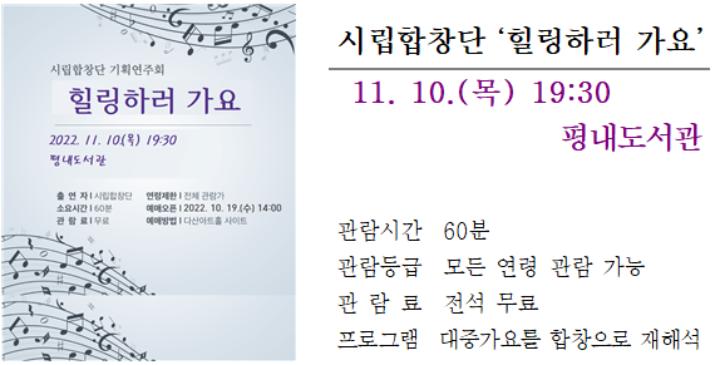 일정 검색 유형선택 전체보기 전체보기 기획공연 대관공연 문화예술 날짜 : 검색하기 이전월 2022년 11월 다음월 공연/문화예술 일정 달력(2022년 11월) : 일, 월, 화, 수, 목, 금, 토요일의 일정 SUN MON TUE WED THU FRI SAT 1 문화예술 2 문화예술 3 문화예술 4 5 문화예술 6 문화예술 7 8 문화예술 9 10 문화예술 11 12 기획공연 13 14 문화예술 15 문화예술 16 문화예술 17 18 기획공연 19 20 21 22 23 24 문화예술 25 문화예술 26 기획공연 문화예술 27 기획공연 28 29 30 2022년 11월 10일 문화일정 문화예술 시립합창단 기획연주회 '힐링하러 가요' 장소 : 평내도서관 4층 공연장 기간 : 22-11-10 관람등급 : 모든 연령 관람 가능