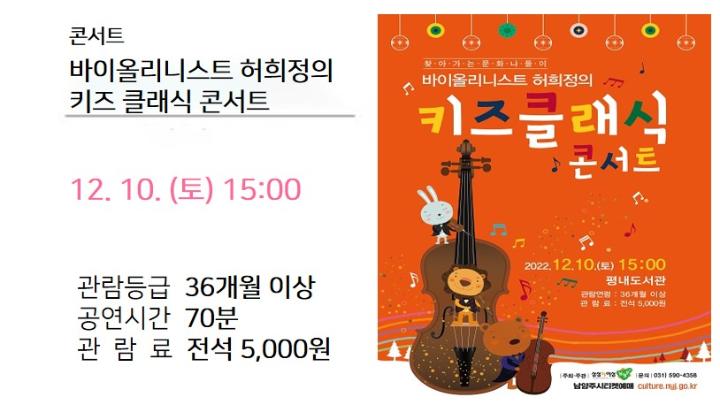 일정 검색 유형선택 전체보기 전체보기 기획공연 대관공연 문화예술 날짜 : 검색하기 이전월 2022년 12월 다음월 공연/문화예술 일정 달력(2022년 12월) : 일, 월, 화, 수, 목, 금, 토요일의 일정 SUN MON TUE WED THU FRI SAT 1 2 3 기획공연 4 5 6 문화예술 7 대관공연 8 9 기획공연 10 기획공연 11 기획공연 12 13 14 15 16 17 18 19 20 21 22 23 24 25 기획공연 26 27 28 29 문화예술 30 문화예술 31 2022년 12월 10일 문화일정 기획공연 [콘서트] 바이올리니스트 허희정의 키즈 클래식 콘서트 장소 : 평내도서관(남양주시 의안로134) 기간 : 22-12-10 관람등급 : 36개월 이상 관람 가능(생년월일 증빙자료 지참 필수)