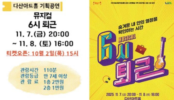 일정 검색 유형선택 전체보기 전체보기 기획공연 대관공연 문화예술 날짜 : 검색하기 이전월 2025년 11월 다음월 공연/문화예술 일정 달력(2025년 11월) : 일, 월, 화, 수, 목, 금, 토요일의 일정 SUN MON TUE WED THU FRI SAT 1 기획공연 문화예술 2 3 4 5 6 7 기획공연 8 기획공연 9 10 11 12 13 14 15 16 17 18 19 20 21 22 기획공연 23 24 25 26 27 28 29 기획공연 30 2025년 11월 7일 문화일정 기획공연 [뮤지컬] 6시 퇴근 장소 : 다산아트홀 기간 : 25-11-07 ~ 25-11-08 관람등급 : 만 7세(2018년생) 이상 관람가능(생년월일 증빙자료 지참 필수)