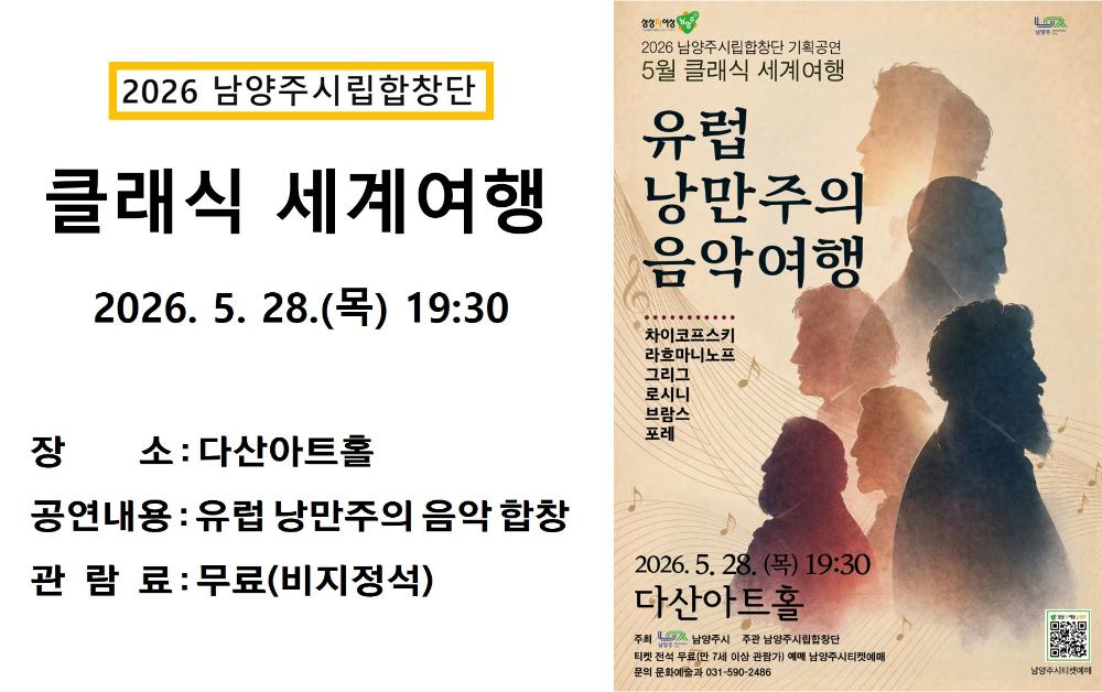 - 남양주문화재단 누리집 오픈 안내 남양주문화재단 출범으로 다산아트홀은 2026년부터 남양주문화재단에서 운영합니다. 2026년 다산아트홀 공연에 대한 안내 및 예매는 남양주문화재단 누리집에서 확인하실 수 있습니다. 공연 예매를 위해서 남양주문화재단 누리집 신규 회원가입이 필요합니다. 남양주문화재단 누리집 회원가입 후 남양주시의 다양한 공연, 전시, 문화예술교육 및 사업에 대한 소식을 만나보시... 2025-12-26