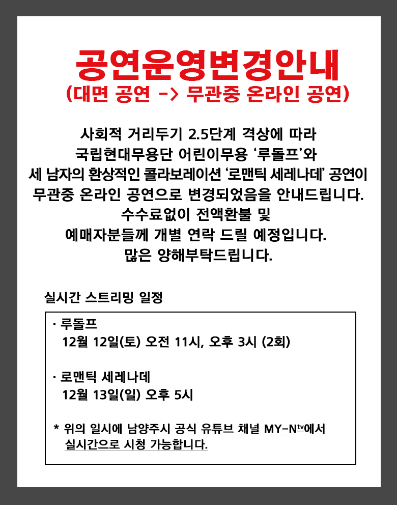 | 2020 다산아트홀 '루돌프', '로맨틱 세레나데' 공연 운영 변경 안내 | |