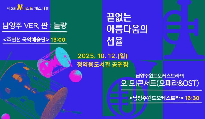 일정 검색 유형선택 전체보기 전체보기 기획공연 대관공연 문화예술 날짜 : 검색하기 이전월 2025년 10월 다음월 공연/문화예술 일정 달력(2025년 10월) : 일, 월, 화, 수, 목, 금, 토요일의 일정 SUN MON TUE WED THU FRI SAT 1 대관공연 2 3 4 5 6 7 8 9 10 11 문화예술 12 문화예술 13 문화예술 14 문화예술 15 문화예술 16 대관공연 문화예술 17 18 기획공연 19 20 21 22 23 24 기획공연 25 기획공연 26 문화예술 27 28 29 30 31 2025년 10월 12일 문화일정 문화예술 N티스트 페스티벌 [2일차] 장소 : 정약용도서관 공연장 기간 : 25-10-12 관람등급 :
