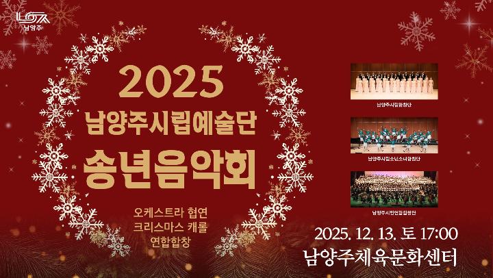 일정 검색 유형선택 전체보기 전체보기 기획공연 대관공연 문화예술 날짜 : 검색하기 이전월 2025년 12월 다음월 공연/문화예술 일정 달력(2025년 12월) : 일, 월, 화, 수, 목, 금, 토요일의 일정 SUN MON TUE WED THU FRI SAT 1 2 3 4 5 기획공연 6 7 8 9 문화예술 10 11 12 13 기획공연 문화예술 14 15 16 17 18 문화예술 19 20 기획공연 대관공연 21 기획공연 22 23 24 25 26 27 28 29 30 31 2025년 12월 13일 문화일정 기획공연 [플라워] 김경호 & 플라워 장소 : 다산아트홀 기간 : 25-12-13 관람등급 : 만 7세(2018년생) 이상 관람가능(생년월일 증빙자료 지참 필수) 문화예술 남양주시립예술단 <송년음악회> 장소 : 남양주체육문화센터 실내체육관 기간 : 25-12-13 관람등급 : 모든 연령